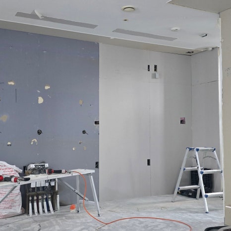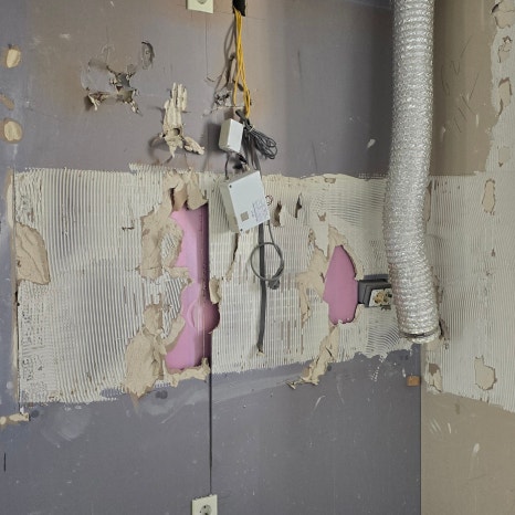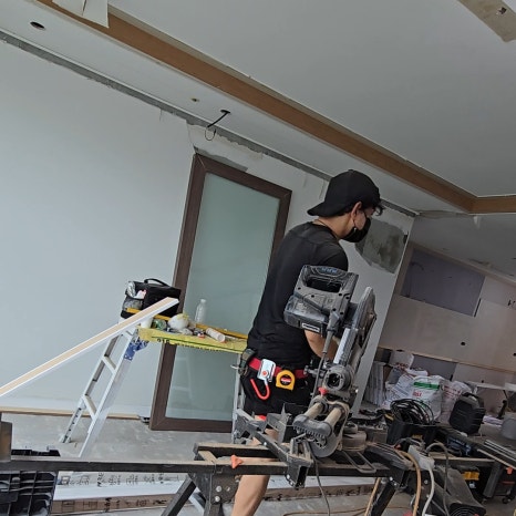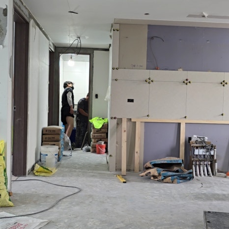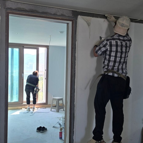 석고 보수와 동시에 전기배선, 바로 타일 시공, 타일 물량, 공법, 자재등 여러가지 과정이 있구요. 직영 반장님들은 모두 오래 일하신 분들입니다.